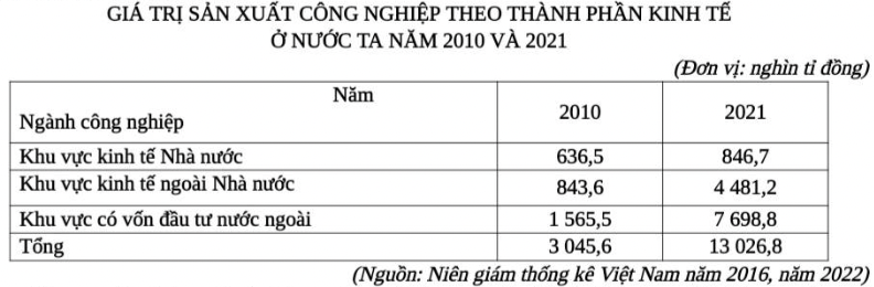GIÁ TRỊ SẢN XUẤT CÔNG NGHIỆP PHÂN THEO THÀNH PHẦN KINH TẾ Ở NƯỚC TA NĂM 2010 VÀ 2021 (Nguồn: Niên giám thống kê Việt Nam 2022, năm 2022)