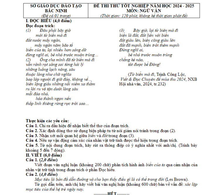 Đề thi thử tốt nghiệp THPT 2025 môn Ngữ Văn – THPT Thạch Thành – Bắc Ninh là một trong những đề thi nổi bật thuộc Bộ đề thi tuyển sinh vào đại học – Môn Ngữ Văn. Với mục tiêu đánh giá năng lực toàn diện của học sinh lớp 12, đề thi này tập trung kiểm tra các kiến thức trọng tâm như kỹ năng đọc hiểu văn bản, phân tích tác phẩm văn học Việt Nam hiện đại và năng lực nghị luận xã hội cũng như nghị luận văn học. Các em học sinh cần nắm vững hệ thống tác phẩm trọng điểm, kỹ năng làm bài nghị luận chặt chẽ và kiến thức về các phong cách ngôn ngữ để đạt kết quả cao trong kỳ thi THPT QG này.