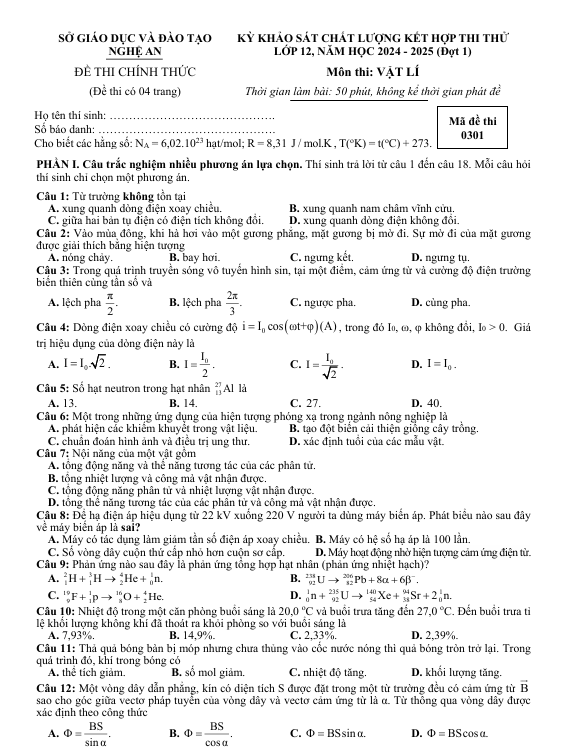 Đề Thi Thử Vật Lý THPT 2025 – Sở GDĐT Nghệ An là tài liệu ôn luyện thuộc môn Vật Lý dành cho học sinh lớp 12 đang sắp bước vào kỳ thi chuẩn bị ôn thi tốt nghiệp THPT. Đây là đề tham khảo được xây dựng theo định hướng cấu trúc đề minh họa của Bộ Giáo dục và Đào tạo, giúp học sinh củng cố các chuyên đề quan trọng như dao động cơ, sóng cơ, dòng điện xoay chiều, sóng ánh sáng và vật lý hạt nhân. Đề thi được biên soạn bởi thầy Nguyễn Văn Tuấn – giáo viên Vật Lý tại Trường THPT Chuyên Phan Bội Châu (Nghệ An) vào năm 2025, với hệ thống câu hỏi bám sát chương trình học và xu hướng ra đề hiện nay.