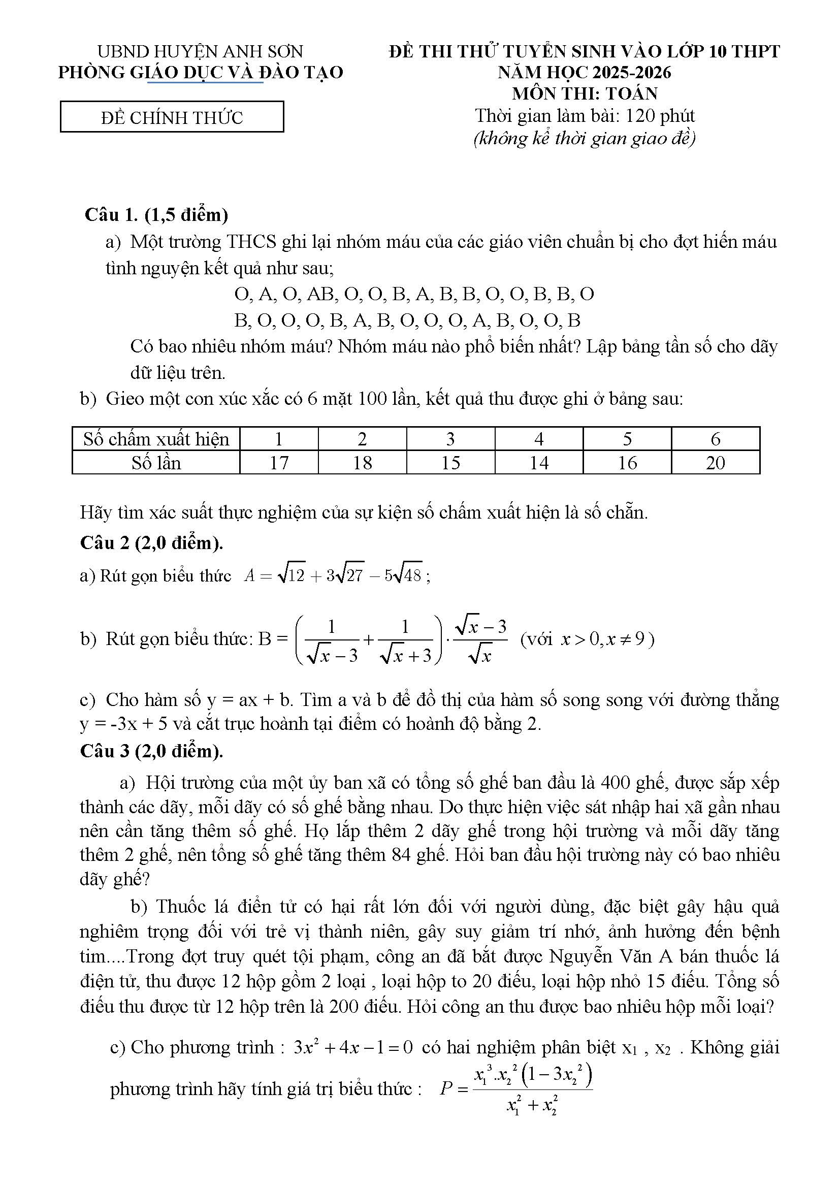 Đề thi thử Toán tuyển sinh lớp 10 năm 2025 – 2026 phòng GD&ĐT Anh Sơn – Nghệ An