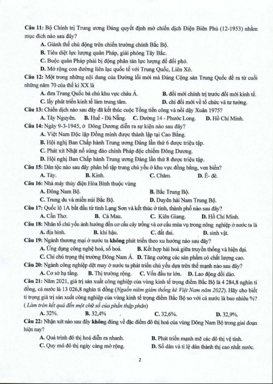 Câu 11: Bộ Chính trị Trung ương Đảng quyết định mở chiến dịch Điện Biên Phủ (12-1953) nhằm mục đích nào sau đây?