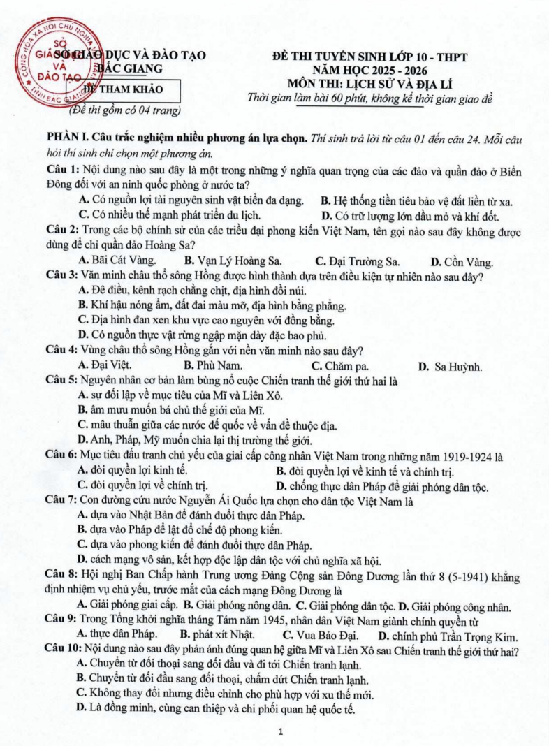 Đề thi vào 10 năm 2025 môn Sử – Sở GDĐT Bắc Giang
