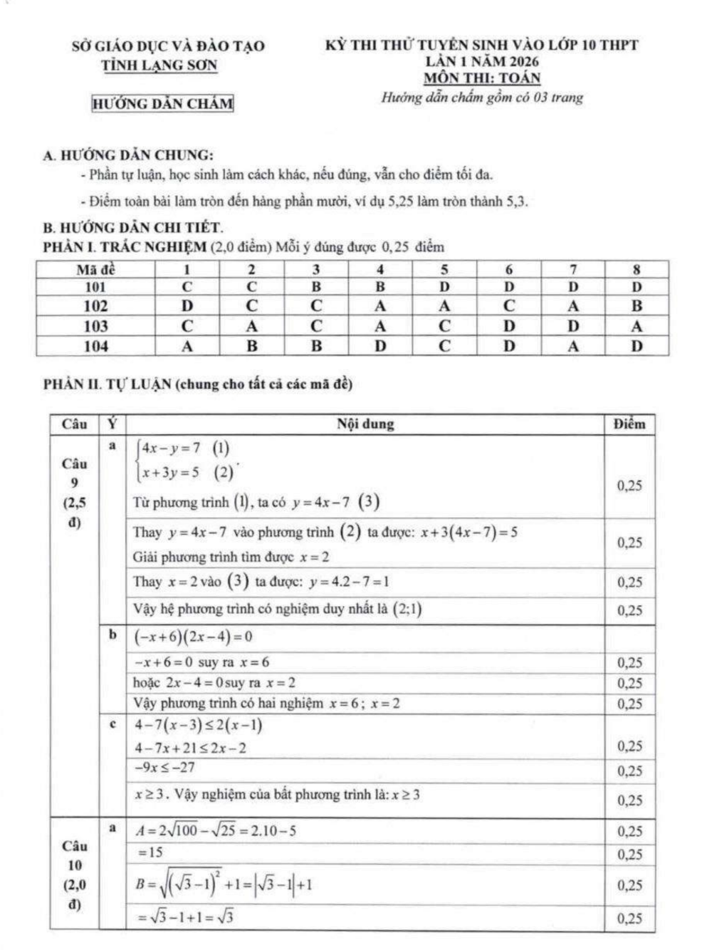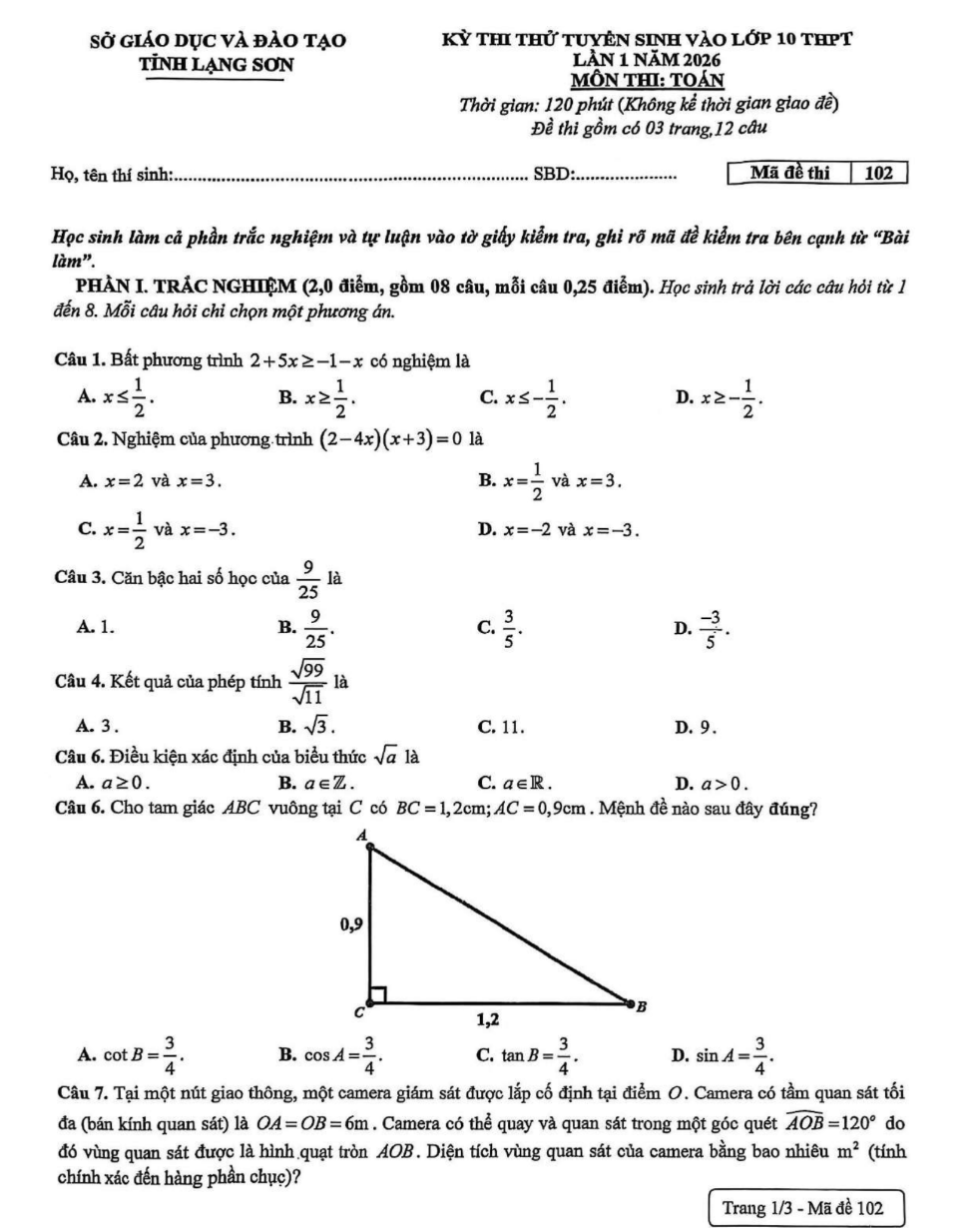 Đề thi vào 10 năm 2026 môn Toán – Sở GDĐT Lạng Sơn (Lần 1) là đề thuộc môn Toán trong kỳ tuyển sinh lớp 10, dùng để đánh giá năng lực tư duy và kỹ năng giải toán của học sinh THCS theo định hướng của Sở. Đề được xây dựng năm 2025 (đợt lần 1) và biên soạn bởi thầy Hoàng Văn Dũng (Tổ Toán, Trường THPT Chuyên Chu Văn An – Lạng Sơn), với cấu trúc quen thuộc gồm phần đại số kết hợp hình học, đảm bảo phân hóa từ cơ bản đến vận dụng. Nội dung thường bám sát trọng tâm lớp 9 như phương trình–hệ phương trình, căn thức, hàm số và đồ thị, bài toán thực tế; kèm bài hình học chứng minh, tính toán liên quan tam giác, đường tròn và các hệ thức đặc trưng. Đây là đề thi tuyển sinh vào 10 hữu ích để học sinh luyện trình bày và phân bổ thời gian.