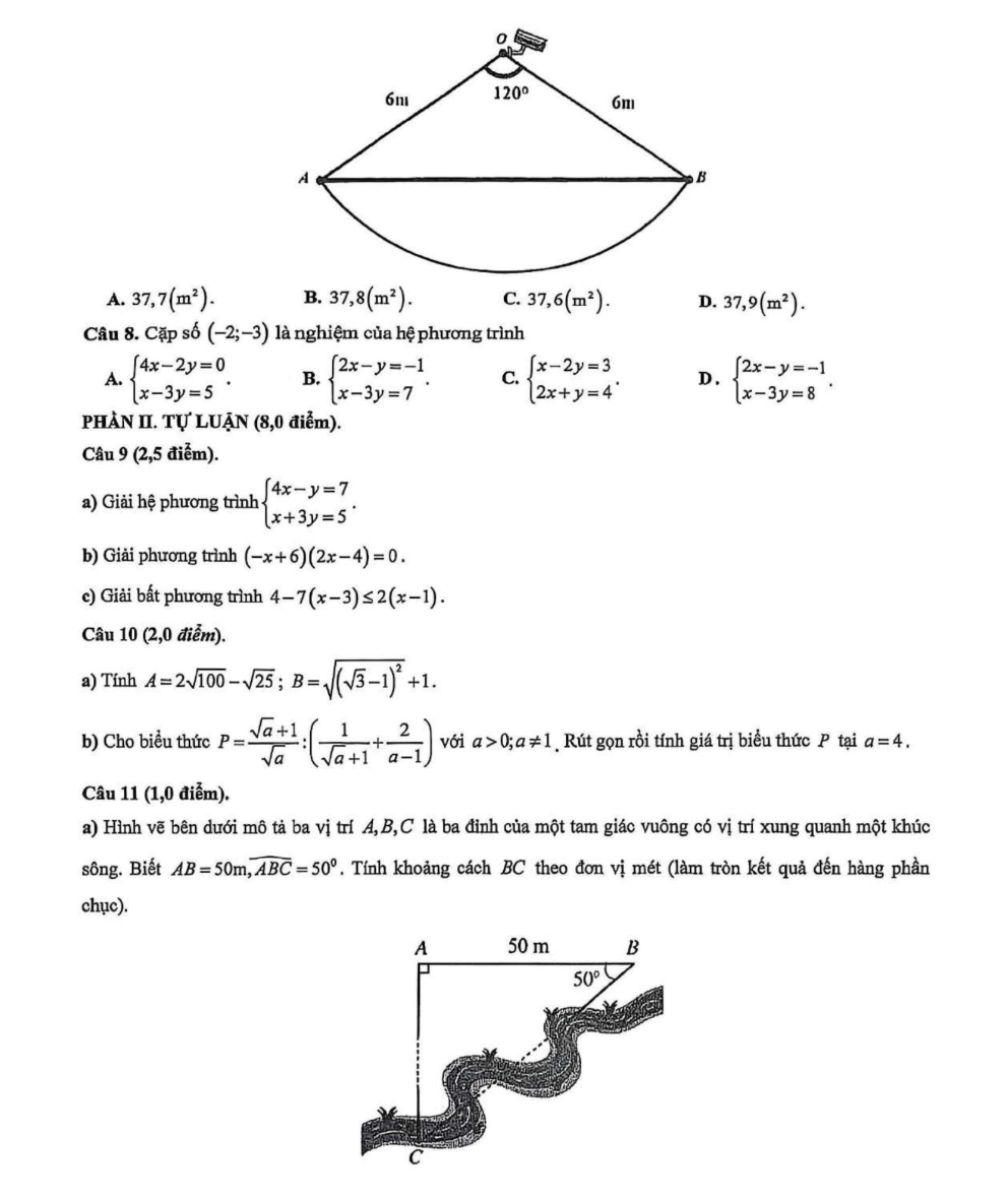 Câu 7. Tại một nút giao thông, một camera giám sát được lắp cố định tại điểm O. Camera có tầm quan sát tối đa (bán kính quan sát) là OA = OB = 6 m. Camera có thể quay và quan sát trong một góc quét góc AOB = 120 độ. Diện tích vùng quan sát của camera bằng bao nhiêu m2 (tính chính xác đến hàng phần chục)?