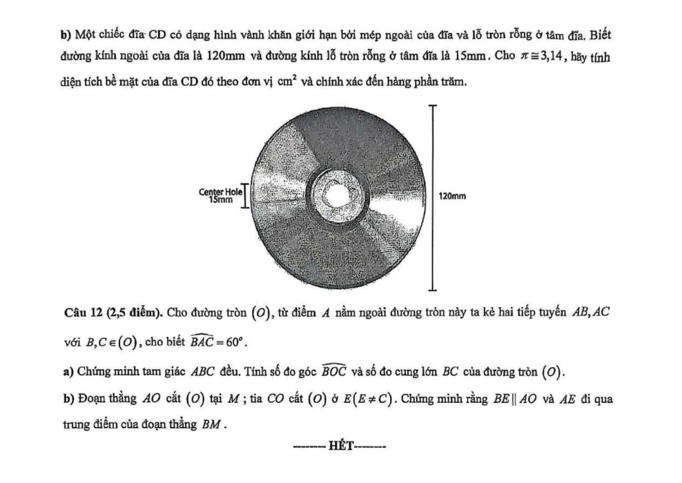 b) Một chiếc đĩa CD có dạng hình vành khăn giới hạn bởi mép ngoài của đĩa và lỗ tròn rỗng ở tâm đĩa. Biết đường kính của đĩa là 120 mm và đường kính lỗ tròn rỗng ở tâm đĩa là 15 mm. Cho số pi xấp xỉ 3,14, hãy tính diện tích bề mặt của đĩa CD đó theo đơn vị cm2 và chính xác đến hàng phần trăm.